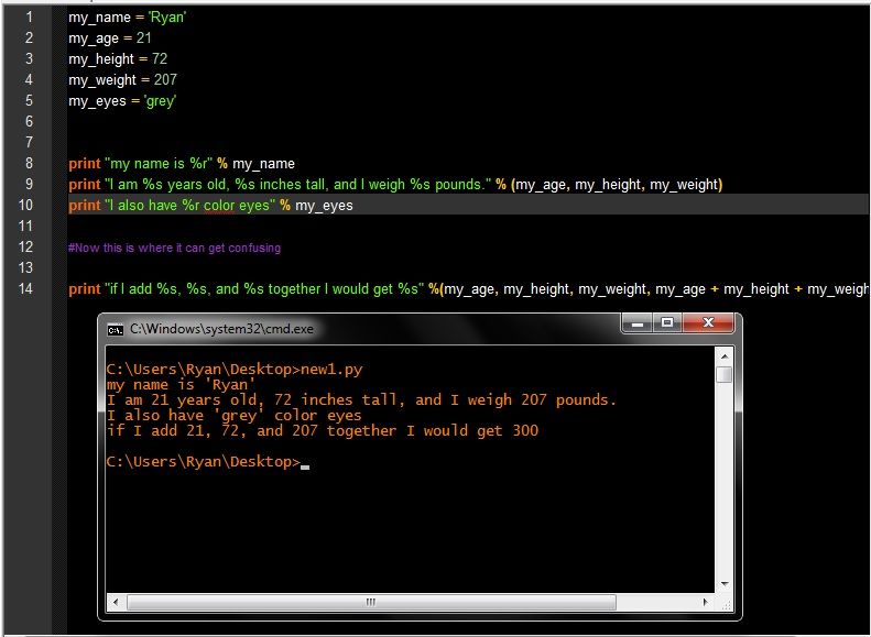 In short, the %r is the word defined functions, while %s is the number based functions. Words and numbers must be separate when given meaning, or else it will be a big mesh of confusion. Adding both words and numbers I like meshing up numbers with letters. It can look like “word938ofjwejffoe” and then where are we? Wonder land. That’s about it for this lesson. I did briefly go over user input, and some lines of text code. In which I will link that to you below all of this.