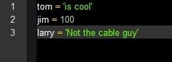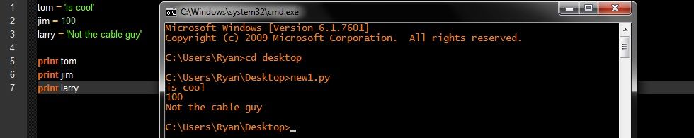 The title may make this lesson look like a scary mesh of gibberish to some of you. Not literally the title, but the general idea of what we are going to being working on today. But don’t worry; this isn’t a hard concept to get at all. So let’s get started on this lesson of programing with python. Firstly, we have to set up words to define. These words can be defined with both numbers and letters. What I mean by this is, we can have the word “Tom” equal “100” or for every time we have the function “print: Tom” we can have it print out the phrase “Is cool!” Sounds fun right? So, how do we achieve this? To put it quite simply, just as easy as I made it sound out to be. Look at the image below to get the idea of what the code will look like.